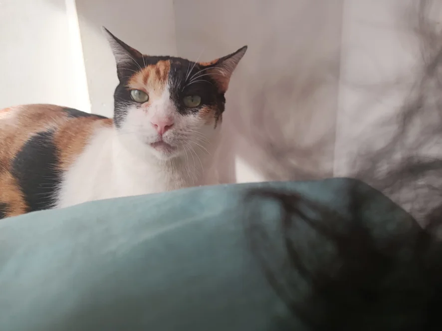Le gusta el pollo y una vez me trajo como regalo un pájaro que ya no estaba suscrito a la vida xc, tiene mala visión y está un poco (muy) rellenita pero es la más hábil de mis gatos, ex gata del monte.